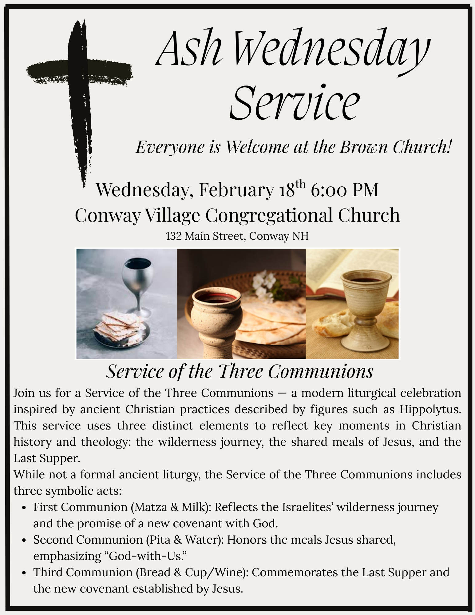 This year’s February vacation week will be a busy one. Valentine’s Day is on Saturday. On Wednesday, Feb 18th @ 6pm we are celebrating Ash Wednesday with a service of the Three Communions. Nancy Irving has put together flyers so we can share that Everyone is Welcome and encouraged to join us.