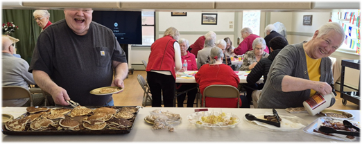The season of Lent is a time of finding ways to draw closer to God. In the past, many people would Fast during Lent. The Fast often included forsaking treats, meat, butter, cream, eggs, chocolate. People would start the Fast on Ash Wednesday, the first of 40 days of Lent. Being practical, people did not want to waste food, so the Tuesday before Ash Wednesday became a day that one consumed all of the foods one was giving up for Lent. The French called that day Mardi Gras (Fat Tuesday), and the English called it Shrove Tuesday (Shrove being the past tense of “to shrive”, or to listen to ones sins and forgive them.) To use up the fatty meats, cream, butter and eggs, many people would make the treat of pancakes. The women of the churches would have races where they ran flipping pancakes in their frying pans! The tradition of Pancake Tuesday survives, so the church served pancakes, bacon, sausage, eggs, butter and real Maple Syrup for Coffee Hour on Sunday, February 15th. Many thanks to the Deacons, and Charlyne, Mike, and Marilyn (YUM blueberries in mid winter!) for the tasty fun Coffee Hour.